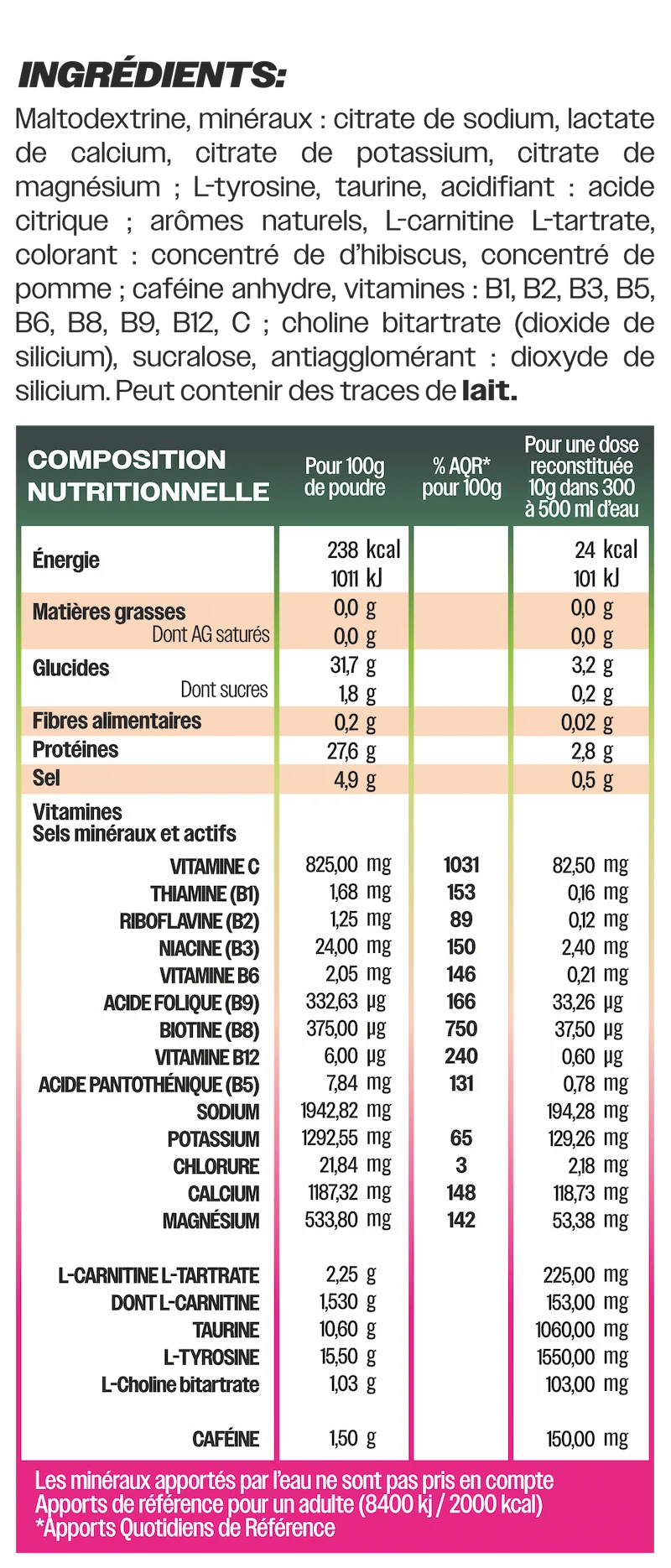 Les arômes et colorants sont 100% naturels.Le reste de la formule (comme certains acides aminés, vitamines ou la caféine) est de synthèse, mais sûr, stable et parfaitement maîtrisé — comme dans la plupart des compléments de qualité.Aucun ingrédient d’origine animale, ni substance inutile ou douteuse.